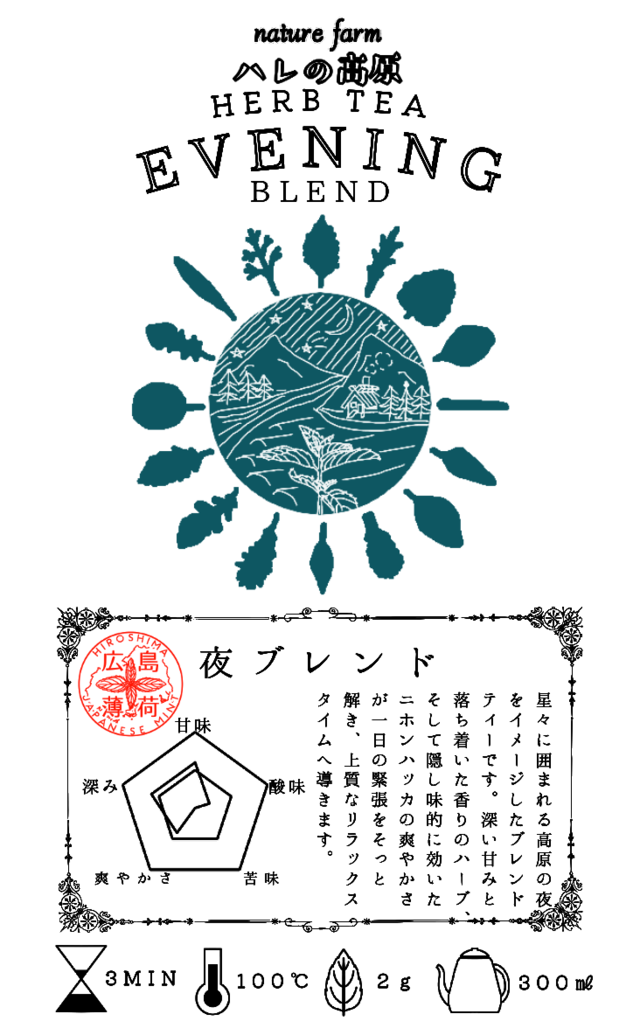 【ハレの高原ハーブティー】 環境に恵まれた世羅高原にて、 環境に優しい栽培方法、自然を最大限に活かした サスティナブルな製茶方法で、農園主がゼロから 一人でこだわって製造しています。 世羅高原産の豊かな香りをおうちカフェ時間に。 ~夜ブレンド~ 星々に囲まれる高原の夜をイメージしたブレンドティーです。深い甘みと落ち着いた香りのハーブ、そして隠し味的に効いたニホンハッカの爽やかさが一日の緊張をそっと解き、上質なリラックスタイムへ導きます。 ・淹れ方 茶葉2gに対し300mlの熱湯を注ぎ、 3分程度蒸らしてからご賞味ください。 二煎目、三煎目もお楽しみいただけます。 お湯の温度や量を変えて味の変化を 楽しむのもおすすめです。 名称:夜ブレンド 原材料名:シナモンバジル、ニホンハッカ、ステビア、赤紫蘇、ペパーミント、ヒソップ、バジル 原料原産地名:広島県世羅町