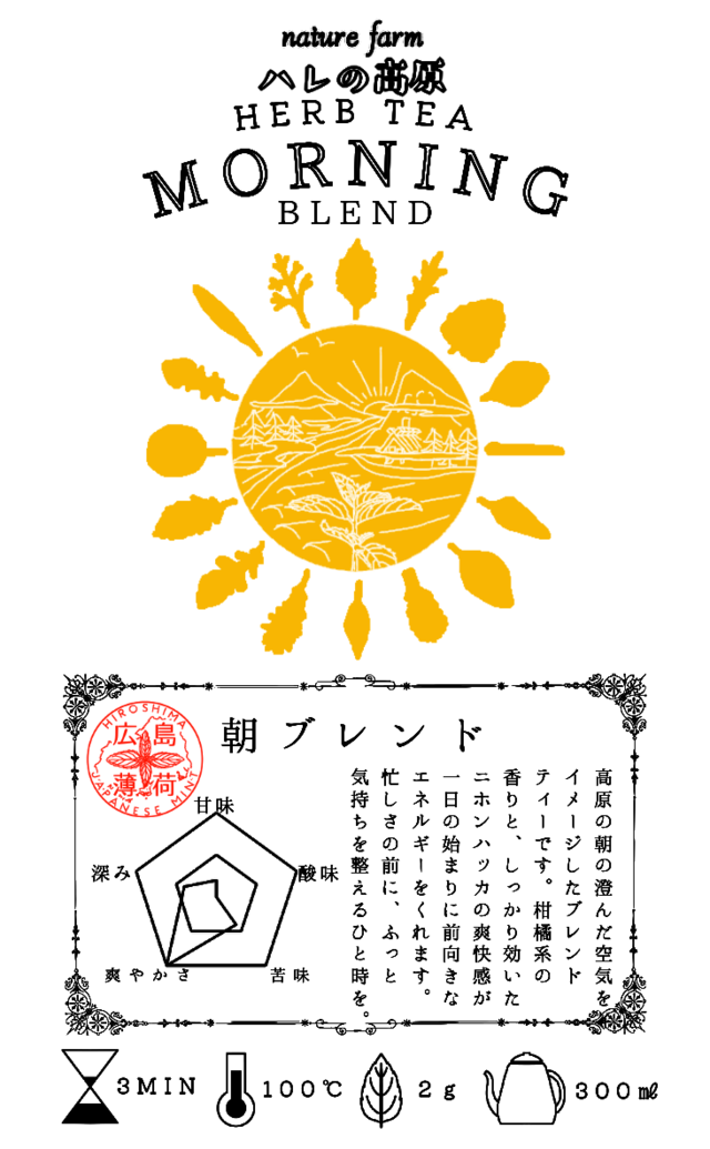【ハレの高原ハーブティー】 環境に恵まれた世羅高原にて、 環境に優しい栽培方法、自然を最大限に活かした サスティナブルな製茶方法で、農園主がゼロから 一人でこだわって製造しています。 世羅高原産の豊かな香りをおうちカフェ時間に。 ~朝ブレンド~ 高原の朝の澄んだ空気をイイメージしたブレンドティーです。柑橘系の香りと、しっかり効いたニホンハッカの爽快感が一日の始まりに前向きなエネルギーをくれます。忙しさの前に、ふっと気持ちを整えるひと時を。 ・淹れ方 茶葉2gに対し300mlの熱湯を注ぎ、 3分程度蒸らしてからご賞味ください。 二煎目、三煎目もお楽しみいただけます。 お湯の温度や量を変えて味の変化を 楽しむのもおすすめです。 名称:朝ブレンド 原材料名:ニホンハッカ、ワイルドベルガモット、フェンネル、レモンバジル、ライムバジル 原料原産地名:広島県世羅町