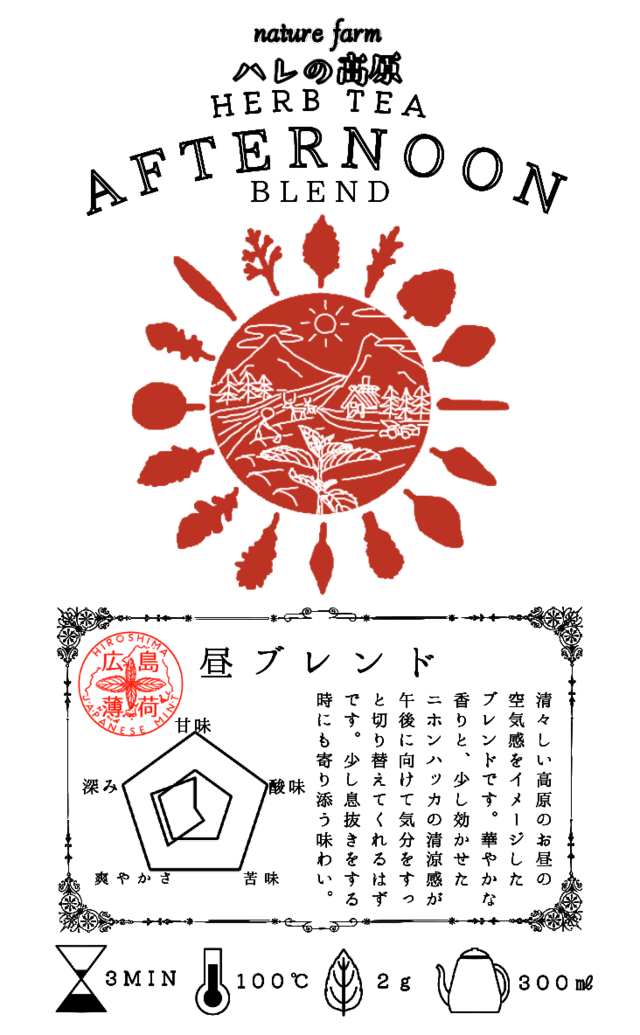 【ハレの高原ハーブティー】 環境に恵まれた世羅高原にて、 環境に優しい栽培方法、自然を最大限に活かした サスティナブルな製茶方法で、農園主がゼロから 一人でこだわって製造しています。 世羅高原産の豊かな香りをおうちカフェ時間に。 ~昼ブレンド~ 清々しい高原のお昼の空気感をイメージしたブレンドです。華やかな香りと、少し効かせたニホンハッカの清涼感が午後に向けて気分をすっと切り替えてくれるはずです。少し息抜きをする時にも寄り添う味わい。 ・淹れ方 茶葉2gに対し300mlの熱湯を注ぎ、 3分程度蒸らしてからご賞味ください。 二煎目、三煎目もお楽しみいただけます。 お湯の温度や量を変えて味の変化を 楽しむのもおすすめです。 名称:昼ブレンド 原材料名:ホーリーバジル、ニホンハッカ、レモンバーム、オレガノ、サマーサボリー、ステビア 原料原産地名:広島県世羅町