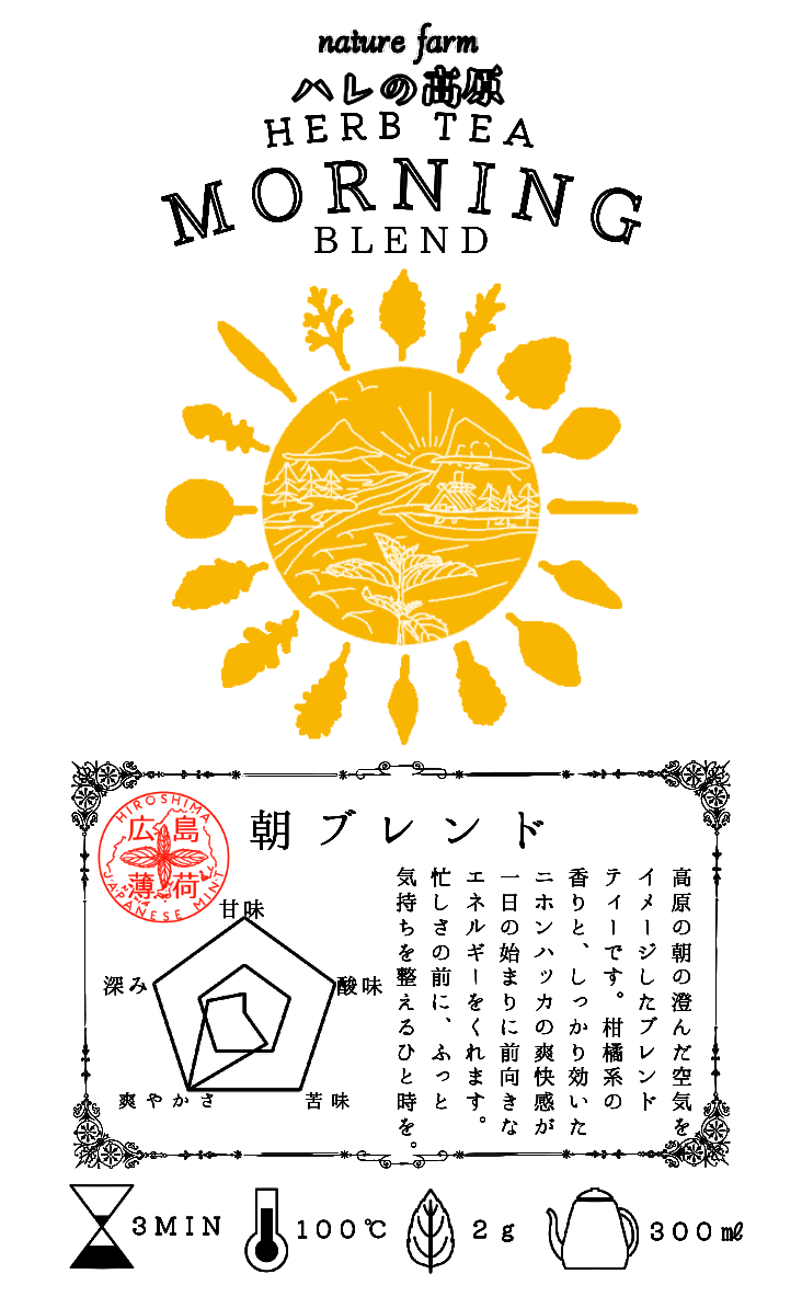 高原の朝の澄んだ空気をイイメージしたブレンドティーです。柑橘系の香りと、しっかり効いたニホンハッカの爽快感が一日の始まりに前向きなエネルギーをくれます。忙しさの前に、ふっと気持ちを整えるひと時を。