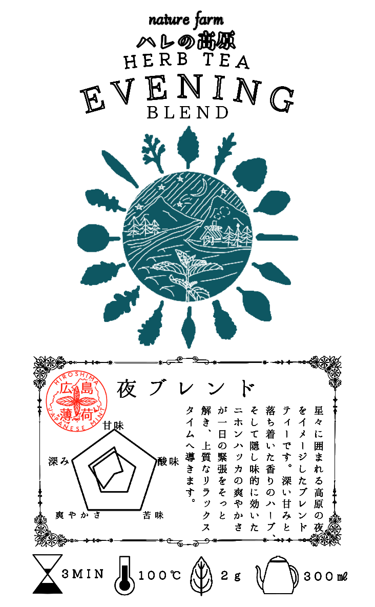 星々に囲まれる高原の夜をイメージしたブレンドティーです。深い甘みと落ち着いた香りのハーブ、そして隠し味的に効いたニホンハッカの爽やかさが一日の緊張をそっと解き、上質なリラックスタイムへ導きます。